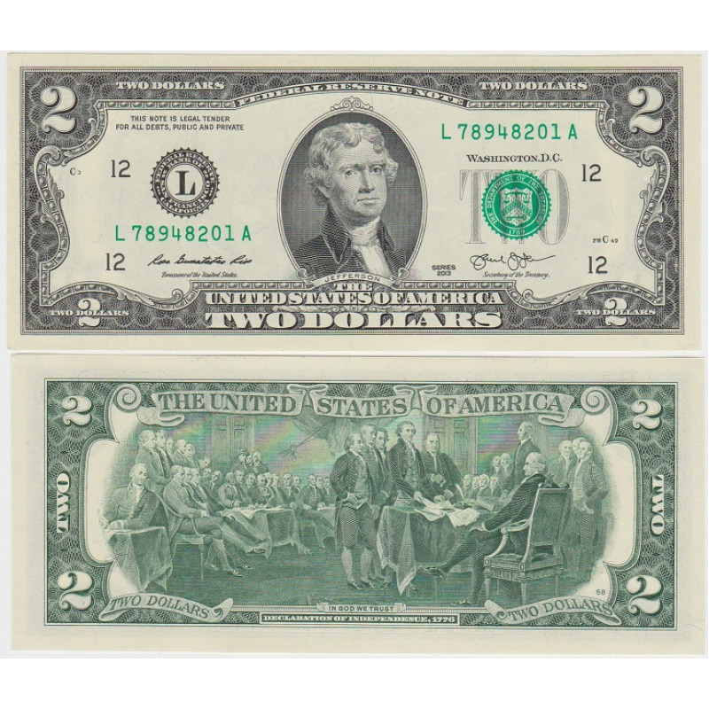 Лицевая сторона: в центре изображен портрет Томаса Джефферсона - одного из авторов Декларации независимости, 3-й президент США . Слева от портрета расположена печать одного из банков-членов Федеральной резервной системы (в зависимости от банка на банкноте изображены разные буквы от A до L),в зависимости от номера буквы в 4 углах помещена соответствующая цифра (1 для А, 2 для В и т. д.). Справа от портрета изображена печать министерства финансов США. На печати помещены весы, символизирующие правосудие. Под портретом - номинал прописью, над портретом надпись: THE UNITED STATES OF AMERICA.