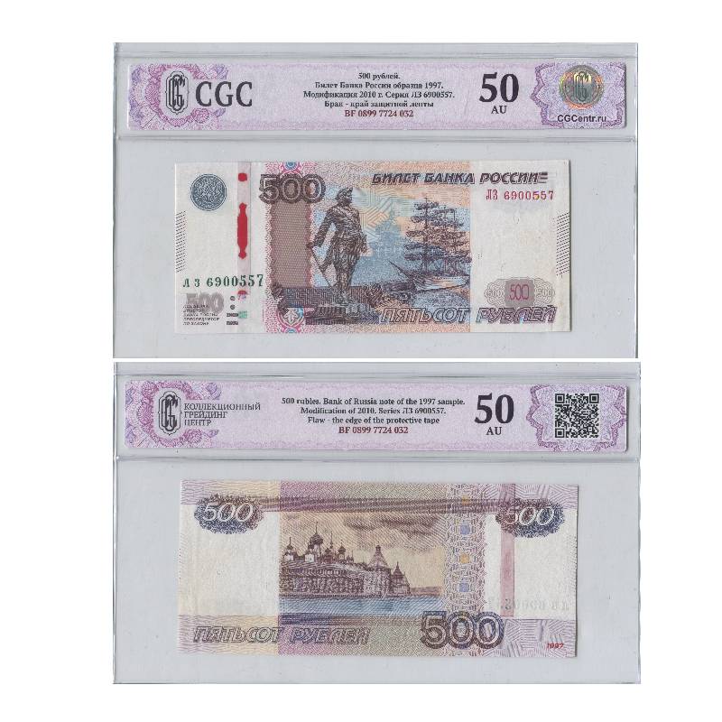 Банкнота 500 рублей России 1997 г. модификация 2010 г., ЛЗ 6900557, брак (AU 50) в слабе