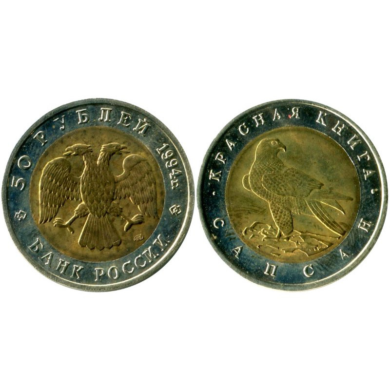 Аверс: изображение двуглавого орла (художник И. Билибин), по окружности надписи, разделённые орнаментом: вверху — «ПЯТЬДЕСЯТ РУБЛЕЙ» «1994″, внизу — «БАНК РОССИИ». Реверс: рельефное изображение сапсана, по окружности — надписи, разделённые двумя точками: вверху — «КРАСНАЯ КНИГА», внизу — «САПСАН» В 1991 году Государственный банк СССР начал выпуск монет необычной серии «Красная книга». На монетах были изображены редкие виды животных, занесенных в Красную книгу Советского Союза. Были выпущены в обращение всего 2 монеты, после этого СССР прекратил свое существование, а выпуск новых монет этой серии продолжил Центральный банк Российской Федерации. 10 ноября 1994 года он выпустил в обращение монету 50 рублей «Сапсан».