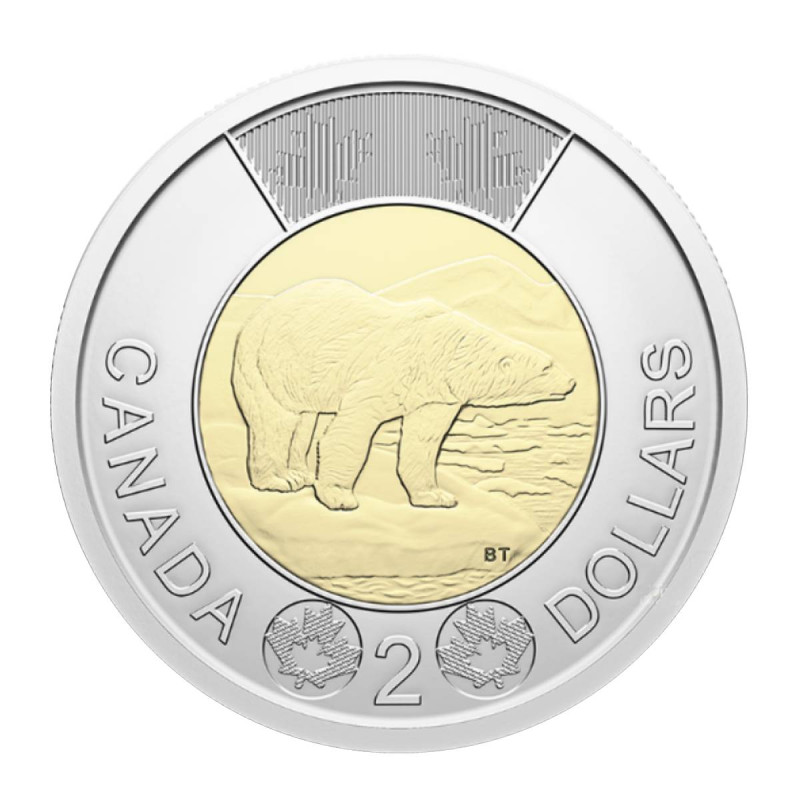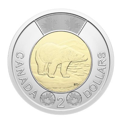 На аверсе изображён портрет короля Карла III, а на реверсе - белый медведь в естественной среде обитания. Каждая монета имеет клеймо монетного двора "W", символизирующее её происхождение из Виннипега, где Toonie чеканится с 1996 г.
