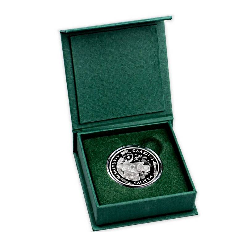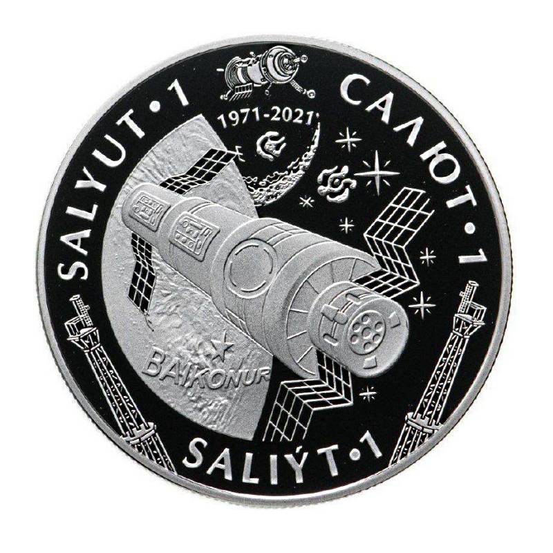 Монета приурочена к 50-летию со дня запуска с космодрома Байконур первой в мире пилотируемой орбитальной космической станции «Салют-1».