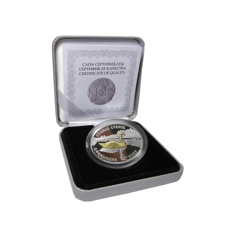 Монета 100 тенге Казахстана 2014 г., Лебедь (серебро. Proof) Лебедь-кликун (лат. Cygnus cygnus) - крупная водоплавающая птица из семейства утиных, весящая от 7 до 10 кг, иногда больше. Тело вытянутое, длина шеи примерно равна длине туловища. Шею кликун держит прямо, не сгибая ее в форме буквы «S», как другие лебеди. Капсула в сувенирной упаковке. Прилагается сертификат.