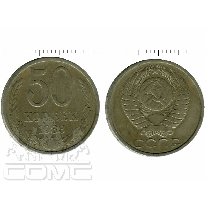 Монета 50 копеек 1983 год Аверс: В центре монеты государственный герб СССР. Связки колосьев перевязаны 15 лентами. В месте смыкания остей колосьев — пятиконечная граненая звезда. Под ней земной шар, в центре которого находятся перекрещенные серп и молот.Ниже расположена аббревиатура «СССР». Реверс: В центре монеты крупная цифра «50» - обозначение номинала, под ней слово «КОПЕЕК» и год выпуска , отштампованные маленьким ровным шрифтом .Обрамляет композицию венок, состоящий из растительных элементов (пшеничные колосья, дубовые листья), разделенный по середине фигурной ракушкой.