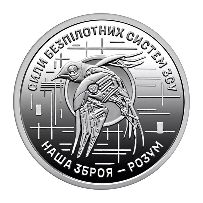 Реверс: по кругу размещены надписи: СИЛЫ БЕCПИЛОТНЫХ СИСТЕМ ВСУ (вверху) и девиз формирования НАШЕ ОРУЖИЕ – УМ (внизу). Главным элементом композиции является эмблема Сил беспилотных систем ВСУ – стилизованная стальная ласточка, символизирующая технологичность, быстроту и адаптивность этого рода сил. Фон реверса дополнен стилизованным изображением воздушных потоков, что подчеркивает динамику, маневренность и мало