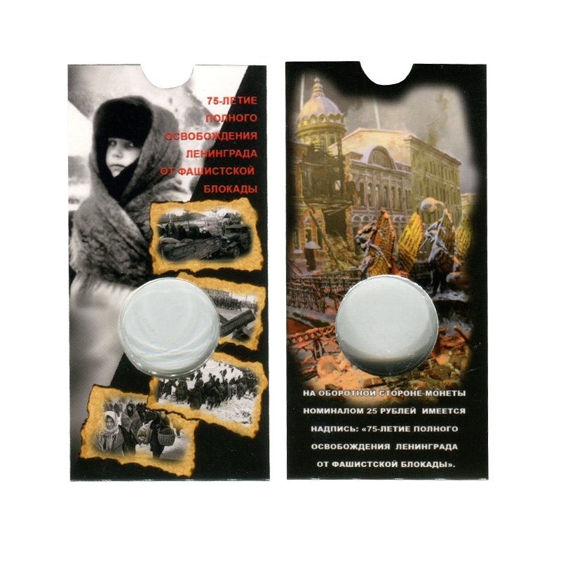 Блистер под монету России 25 рублей 2019 г., 75-летие полного освобождения Ленинграда от фашистской блокады.Блистер для хранения монет выполнен из ламинированного картона с тематической иллюстрацией, ячейка из прозрачной пленки ПВХ позволяет рассмотреть обе стороны. Диаметр ячейки соответствует диаметру монеты. Для помещения монеты в ячейку надавите до щелчка.Блистер прекрасно сохранит вашу монету. Для серии монет в блистерах мы производим специальный лист на 6 ячеек формата оптима (ЛМБ6-О)