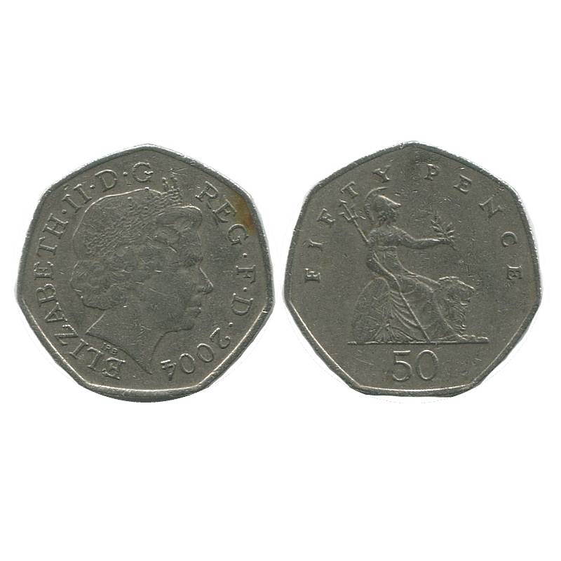 На реверсе в центре аллегория Британия - изображение сидящей на льве женской фигуры с гербовым щитом, трезубцем в правой руке, вверху полукругом надпись "FIFTY PENCE", внизу цифра номинала "50".
