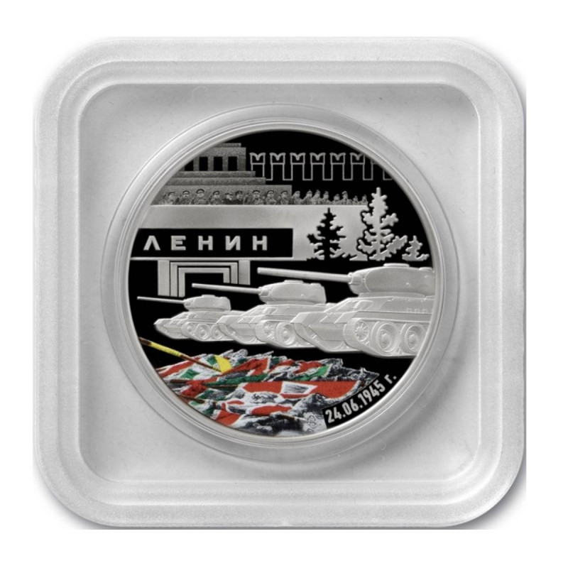 На тематической стороне жетона у трех советских танков, мавзолея Ленина и очертаний зубцов (мерлонов) кремлевской стены изображены поверженные немецкие знамена в цветном исполнении. Указана и конкретная дата проведения парада.