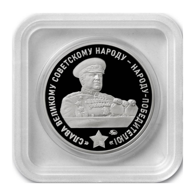 другую сторону жетона помещен портрет маршала Жукова у микрофонов,