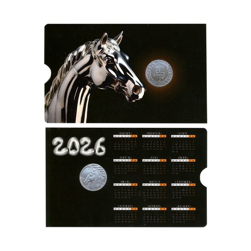 Календарь на 2026 год с жетоном год Лошади. цвет календаря черный. Размеры календаря 140*86мм